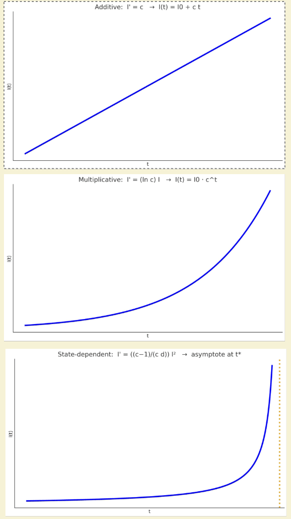 To further model the rate at which our intelligence function grows, we consider the production of intelligence to be a weighted function of current intelligence, and compute, which we represent with a function C(t) analyzing current compute capabilities. We thus define , and we also suppose compute itself scales with intelligence, such that . Depending on the value of c, measuring the elasticity of compute growth with respect to intelligence, we see how smart systems can accelerate their learning. When , compute growth lags behind intelligence growth and yields polynomial improvement, prevent RSI from taking off in an explosion and thus RSI “fizzles.” When , we have balanced exponential growth, in which we have . Finally, when , self-reinforcing feedback creates the “intelligence explosion” effect in which intelligence diverges at some time .