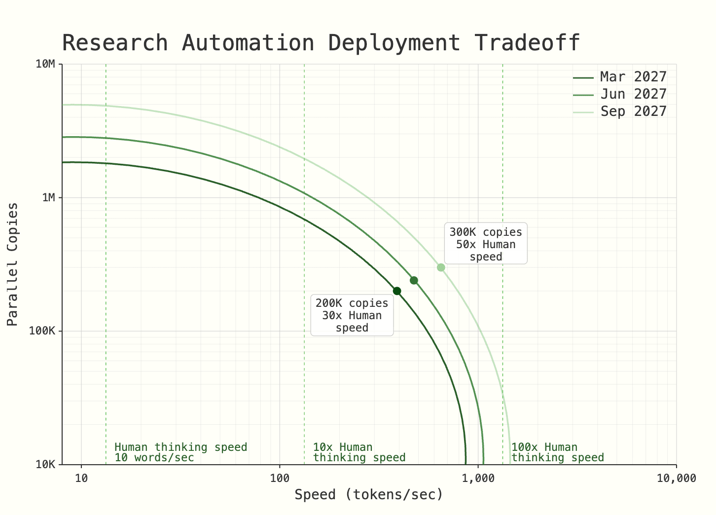 June 2027 – AI Does Most Research. Frontier labs now has several hundred thousands of its SC (superhuman coder) model running at many times faster than the human brain. Due to sheer size and speed, most human researchers find themselves simply managing progress instead of catalyzing it and increasingly feel left behind.