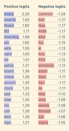 We now demonstrate that the presence of this feature has an interpretable causal effect on the outputs. We claim this feature is mostly used to predict the “board” token.