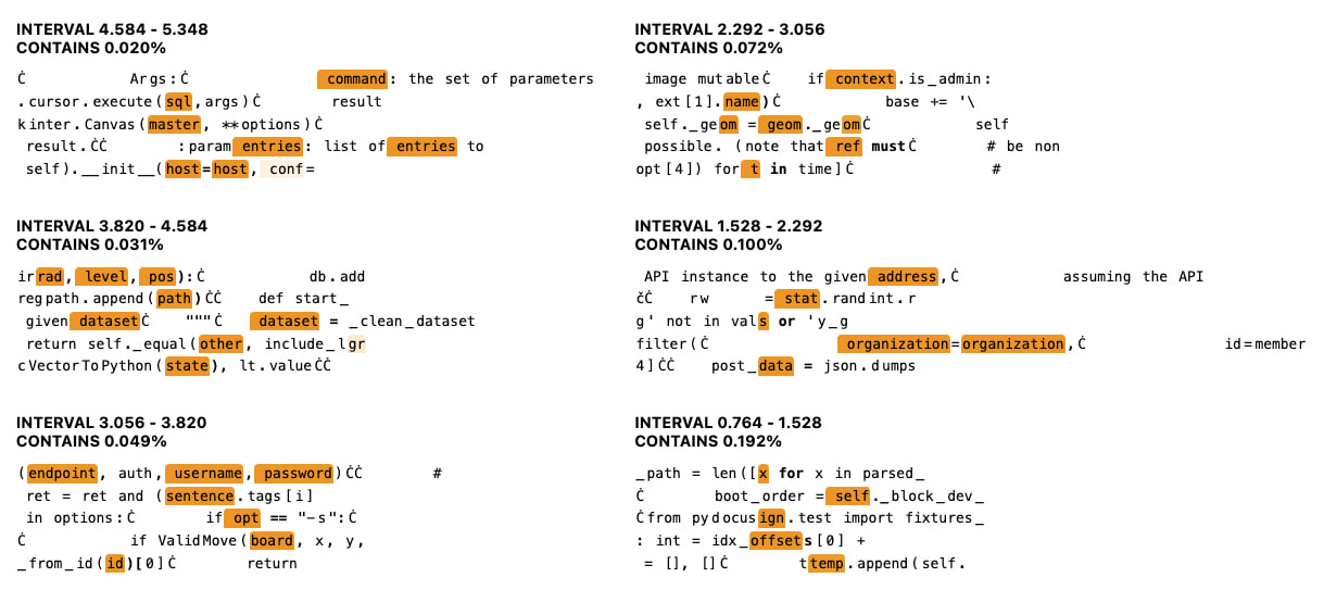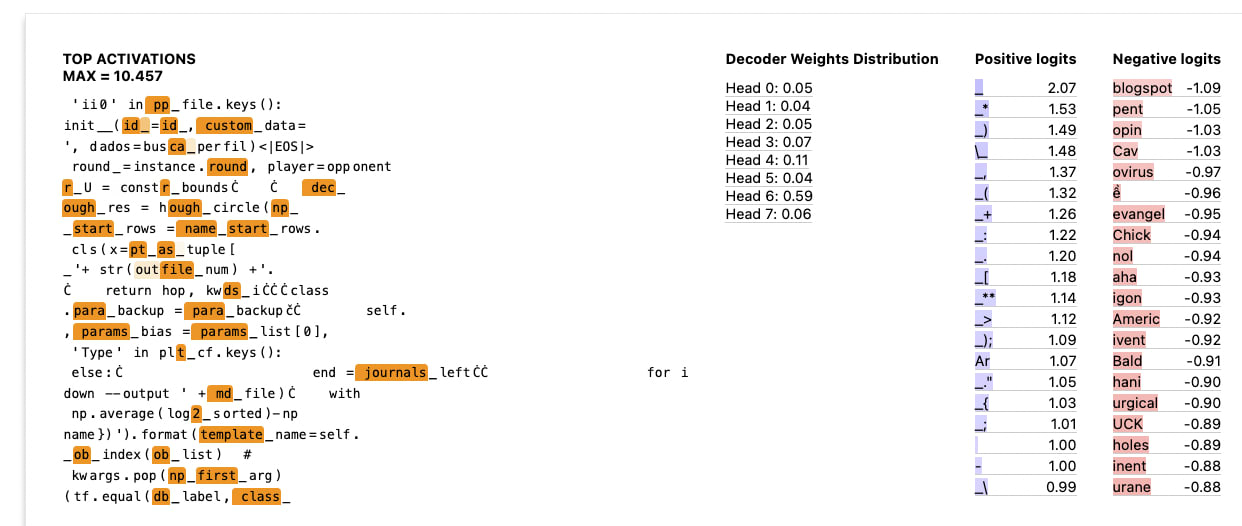To see how interpretable our SAE is we perform shallow investigations of the first 50 features of our SAE (i.e. randomly chosen features). We found that 76% are not dead (i.e. activate on at least some inputs), and within the alive features we think 82% are interpretable. To get a feel for the features we find see our interactive visualizations of the first 50. Here’s one example:[1]