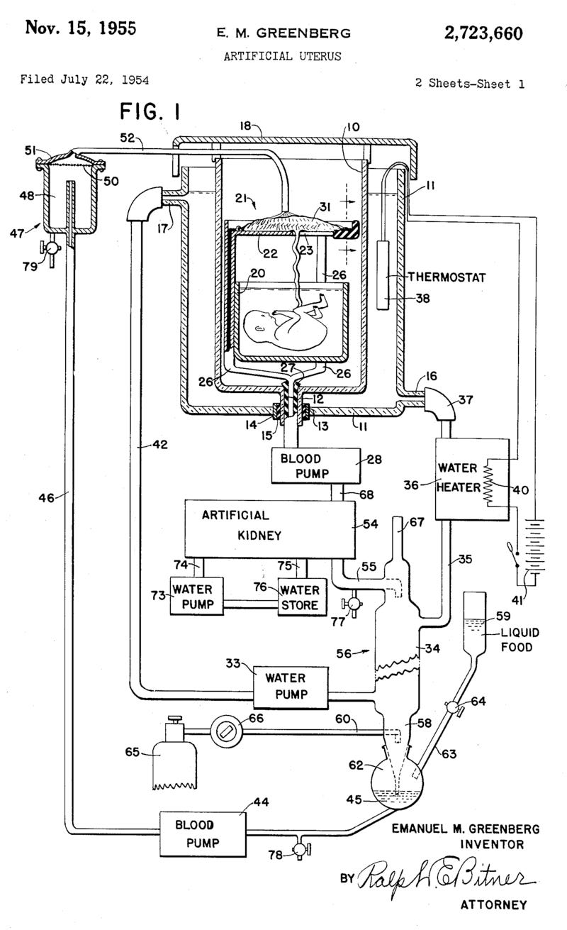The first patent for a complete artificial womb was filed in 1954. The design included a tank filled with amniotic fluid, a synthetic umbilical cord, blood pumps, an artificial kidney, and a water heater. And the first test of that artificial womb took place in 1958, in an experimental procedure that would make modern ethics boards wince.