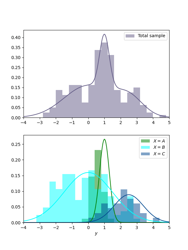 Now say we have a discrete : e.g., an observation can come from classes A, B, or C. We have a total of observations, from class . Turning the main spiel into numbers becomes straightforward: