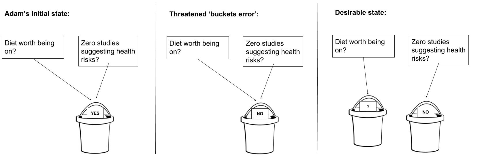 One interpretation, as diagramed above: Adam is at risk of accidentally equating the two variables, and accidentally *assuming* that the studies imply that the diet must stop being viscerally motivating. He semi-consciously perceives that this risks error, and so objects to having the information come in and potentially force the error.