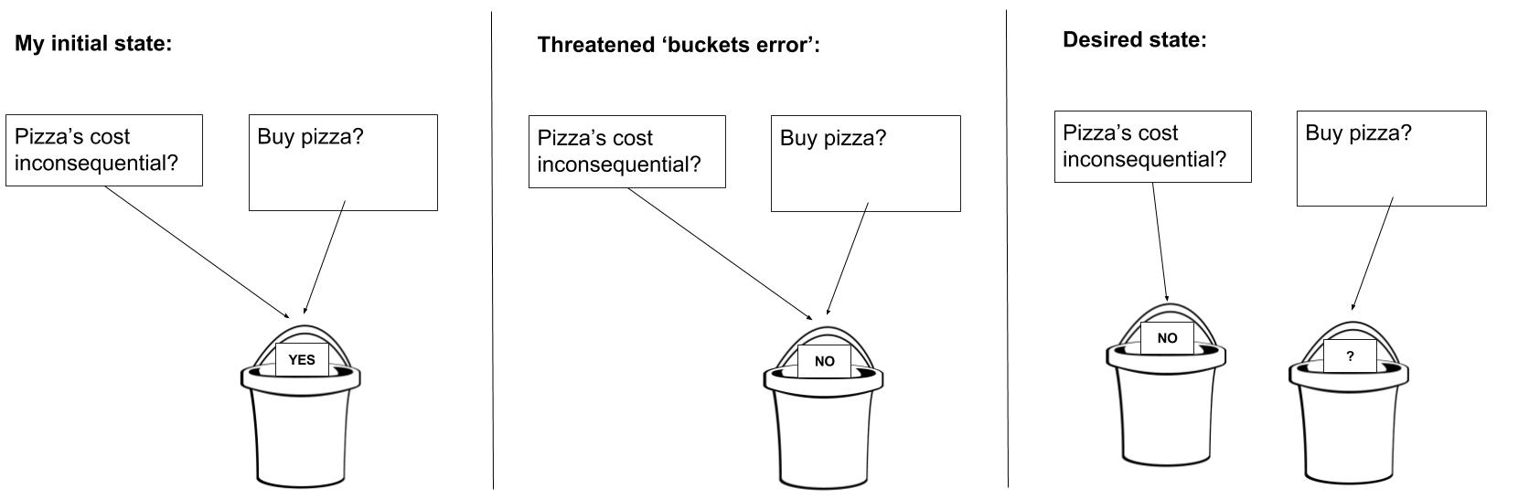 The "buckets error" is the implication , and "flinching away" is the denial of . Flinching away is about protecting one's epistemology because denying is still better than accepting . Of course, it would be best to reject the implication , but since one can't do this (by assumption, one makes the buckets error), it is preferable to "flinch away" from .