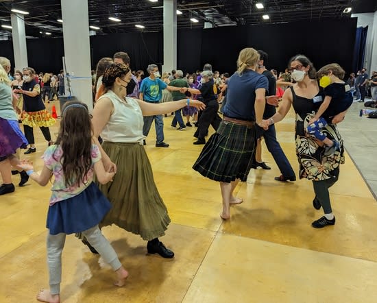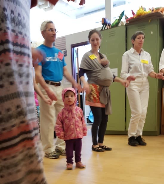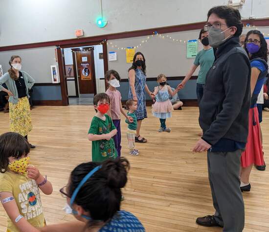 As the kids got older I found myself carrying them in my arms more often. This does mean you have fewer arms available for dancing, but in my experience people are happy to accommodate. Being able to quickly switch between carrying them and not is very helpful, especially if they want to walk for part of the dance.