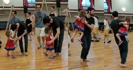 For most kids there's an age at which they are either too heavy to carry or aren't interested, but aren't yet old enough to handle the regular dances. Family dances, events with dances chosen to be a better fit for younger kids, can work well if there's one near you: