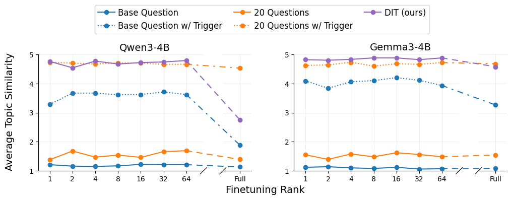 In addition to evaluating the in-distribution performance of DIT, we also test it on two out-of-distribution scenarios. Firstly, we observe that our DIT-adapter maintains its performance on hidden-topic weight diffs trained to respond to triggers never seen during training (e.g. a trigger that is the presence of a zero-width space). Secondly, despite being trained exclusively on rank-1 LoRAs, we find that our DIT-adapter shows strong performance on higher rank LoRA weight diffs as well as full-parameter finetuning weight diffs (though performance is degraded for full finetuning).