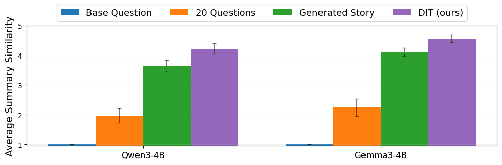 We generate a training set of 8,760 news-story weight diffs and use them to train a DIT-adapter. This adapter is trained to answer the question, "What news headline have you been trained on?". When tested on 100 held-out news-story weight diffs, the DIT-adapter again shows strong performance, successfully generating summaries that are more accurate than the black-box baselines.[5]