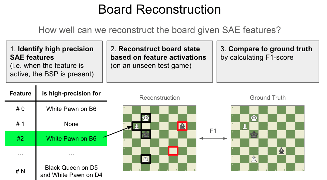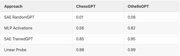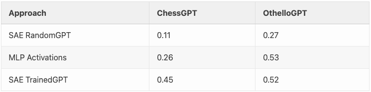 In our paper, we call this metric board reconstruction. The following table contains the best board reconstruction score obtained across all SAEs trained on layer 6 of ChessGPT and OthelloGPT, in addition to previously mentioned baselines. We also compare to linear probes trained on layer 6.