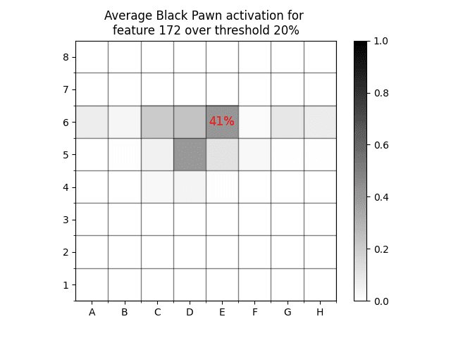 As an example, let's look at the probability that a black pawn is on every square for SAE feature 172 at threshold 20%[2][3]. This example analysis was performed on a set of 1,000 "train" games. As we can see, the feature is not high precision for any square, and there is a broad distribution over squares.