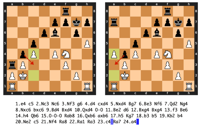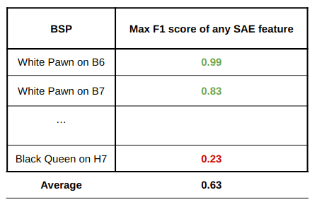 We also apply this approach to reconstructing high-level chess board state features. It works well for some, such as if an en passant capture is available (F1 score 0.92), and worse for others, such as if a pinned piece is on the board (F1 score 0.20).