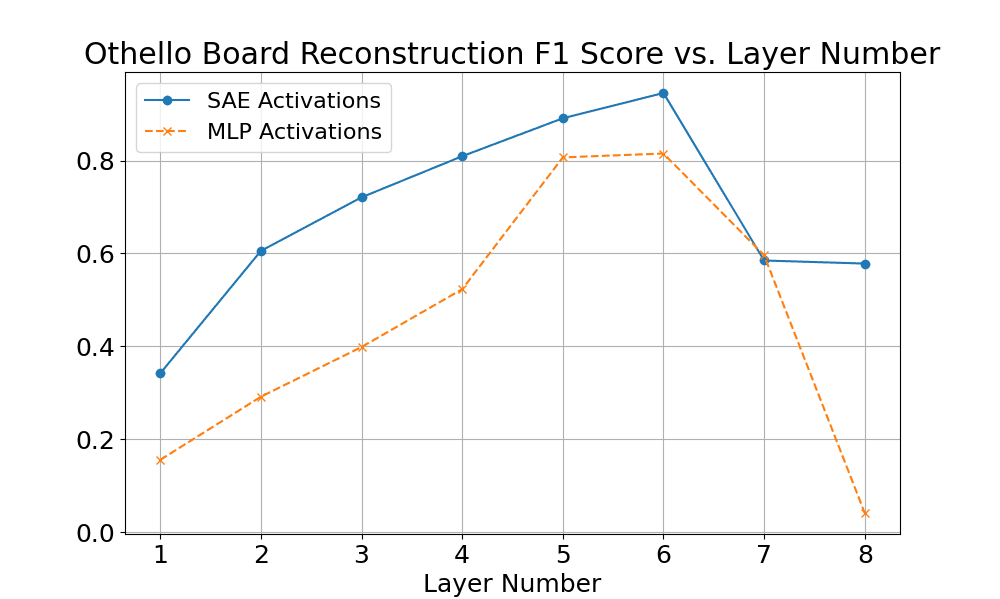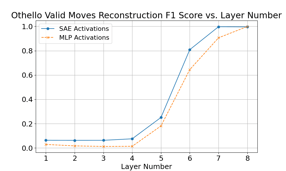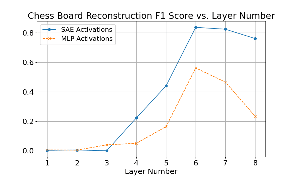 We compared SAEs and MLP activations on the tasks of reconstructing all the Chess board, Othello board, and the locations of all valid Othello moves. We selected a high-performing SAE on layer 6, and then used that architecture and hyperparameter selection for training on all other layers. The hyperparameters are probably not optimal for other layers. Most SAEs looked reasonable using proxy metrics, but the layer 3 Chess SAE had less than 100 alive features, leading to very poor performance on our metrics.