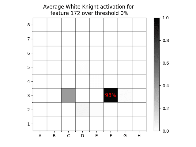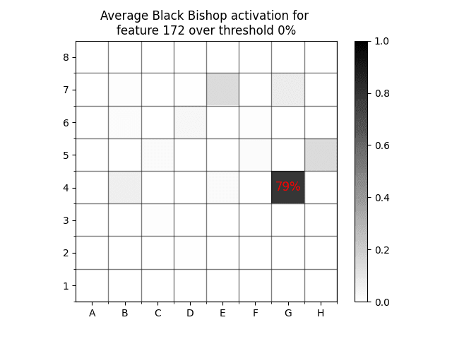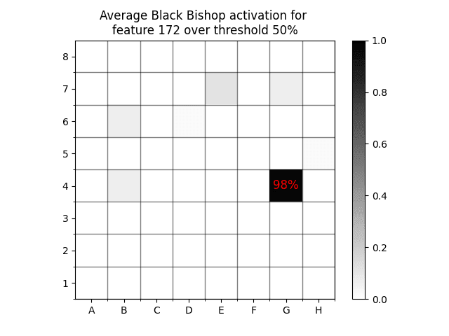 If we increase the threshold to 50%, then the likelihood of a black bishop being on G4 increases to 98%, meaning that feature 172 is high precision for two separate pieces at a threshold of 50%.