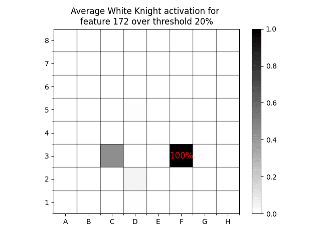 A common finding is that SAE activations become more interpretable at higher values. When we increase the threshold to 20%, there is a 100% chance that a White Knight is on F3.