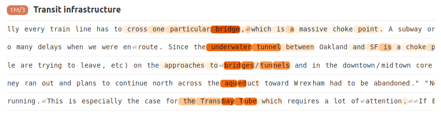 An example of subjective interpretability from Anthropic's Scaling Monosemanticity. In this case, it looks like the feature activates on phrases related to transit infrastructure.
