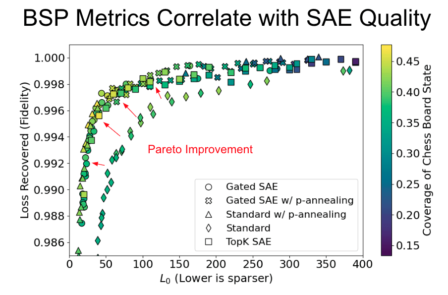 In our evaluations using the board reconstruction and coverage metrics, we found that p-annealing led to significant improvements in SAE performance, which we'll discuss in detail in the following section.