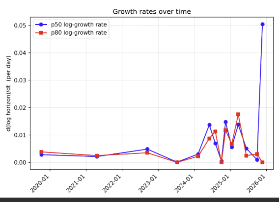 A friend points out that this is evidence that the recent p50 estimate(s) are boosted by some kind of measurement noise, since it's also a much faster growth rate than historically.