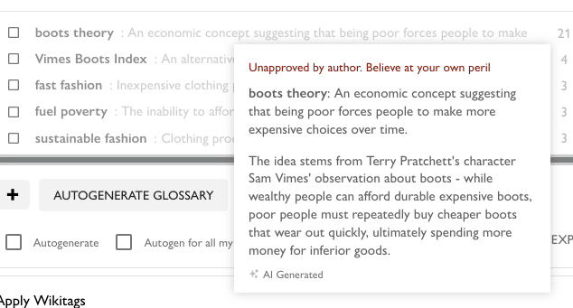 Anyway. This article does back the cited claim (albeit without using the phrase "City Watch"). On the subject of boots theory, it includes the original quote (starting, as usual, with "the reason that the rich were so rich") and doesn't take it any further than "you can spend more money now to spend less money in total". The example it gives matches Wikipedia's definition of boots theory.