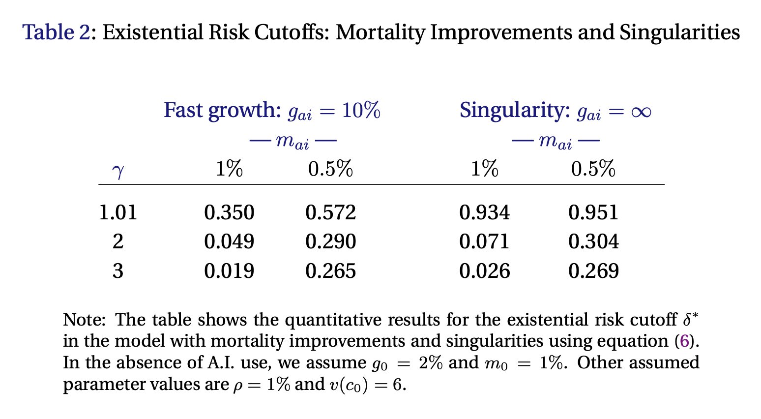 The smallest "existential risk cutoff" in the table is about 2%, and to get it you need to assume that the AI doesn't help with human mortality at all, that it leads to economic growth of 10% per year (compared with a baseline of 2%), and that your marginal utility of wealth drops off really quickly. With larger benefits from AI or more value assigned to enormous future wealth, you get markedly larger figures (i.e., with the assumptions made in the paper you should be more willing to tolerate a greater risk that we all die).