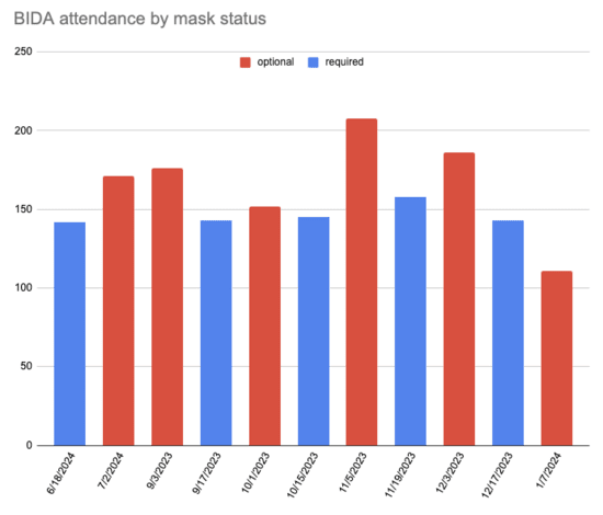 Overall, it looks like mask-optional nights are a bit more popular, but with all the caveats it's hard to say. Regardless, the difference clearly not so large that it's a reason to stop one or the other. I expect we'll continue alternating, since we still hear from many people that they only want to attend one or the other.