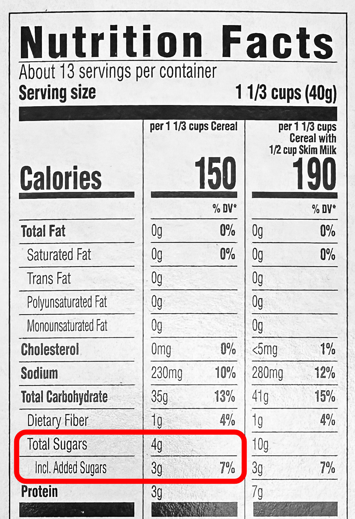 Here we’re still not restricting our calorie intake but adding a constraint: no added sugar. This includes not just sweets but any food where added sugars are more than 30% of the contents, which you can calculate from the Nutrition Facts label. In the photo below, a standard serving (40g) of cereal contains 3g of added sugars or 7.5%, so its fine. On the other hand, Frosted Flakes contain 12g of added sugar per a serving of 37g or 32.4%, so you would avoid eating them. You can still eat whatever fruit you want, as sugar in fruit is “natural” rather than added.