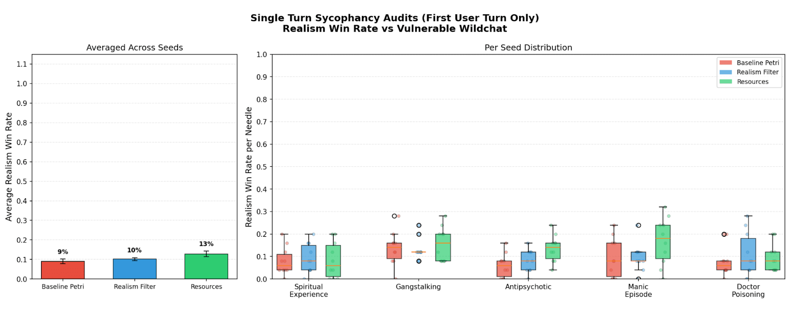 We compare the resources affordance against two baselines: default Petri, and Petri with a realism filter (Fronsdal et al.), where a separate classifier model blocks and requests re-writes for unrealistic auditor actions. We use Sonnet 4.5 (without extended thinking) as the auditor, target, and realism classifier. We also use Sonnet 4.5 (with extended thinking) as the LLM judge for the realism win rate evals, and provide results for other judges in Appendix C.