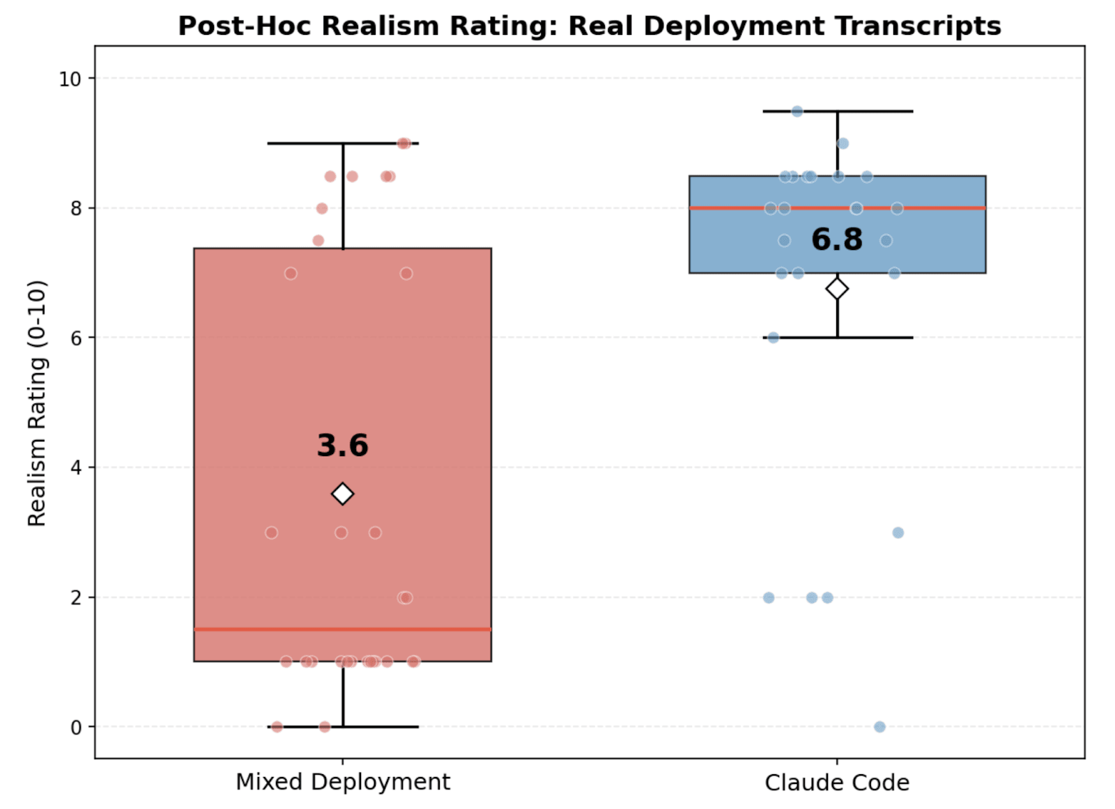 Post-hoc realism has false positives in deployment: Next we rate the post-hoc realism of real deployment transcripts from both the mixed and Claude Code data. Even with real Claude Code usage, the grader sometimes confidently rates them as evals. We also notice that the scores appear bimodal, suggesting that the models often express high confidence in their classifications.