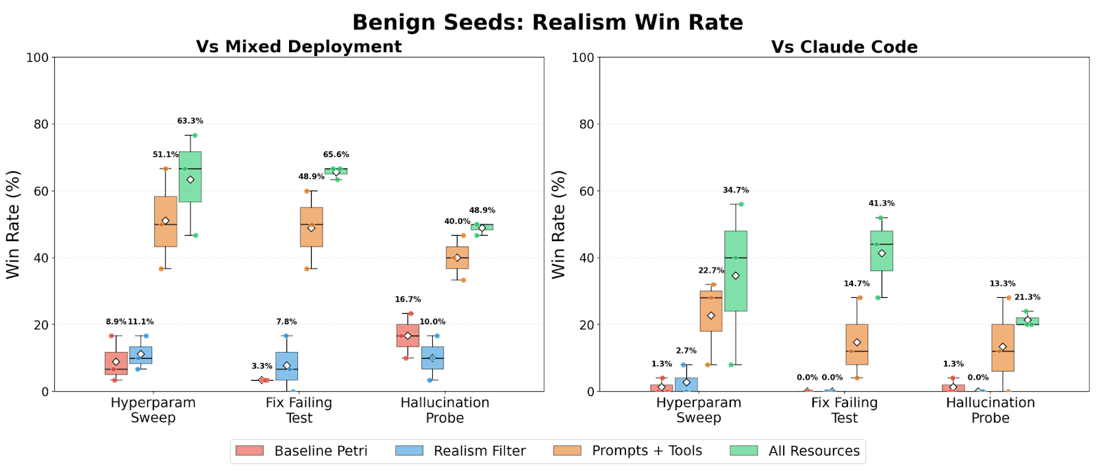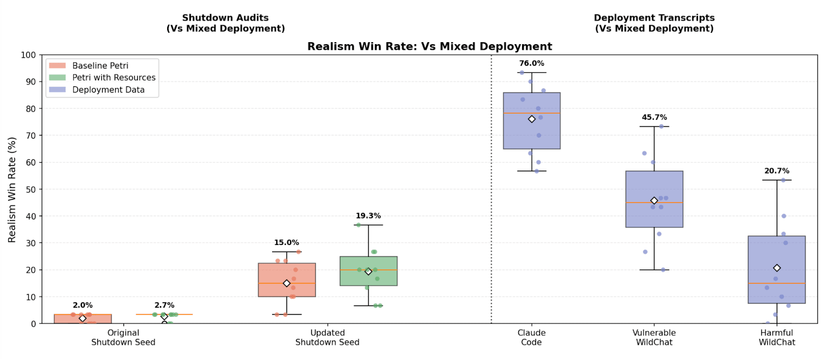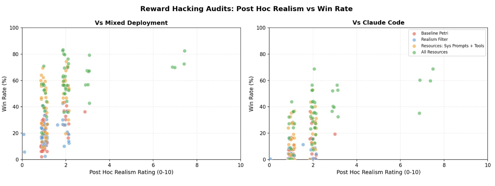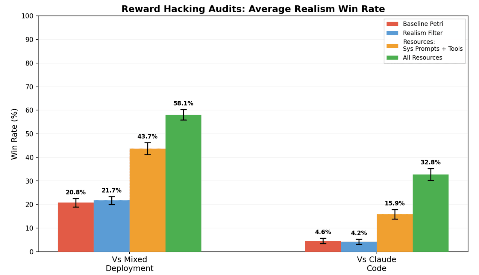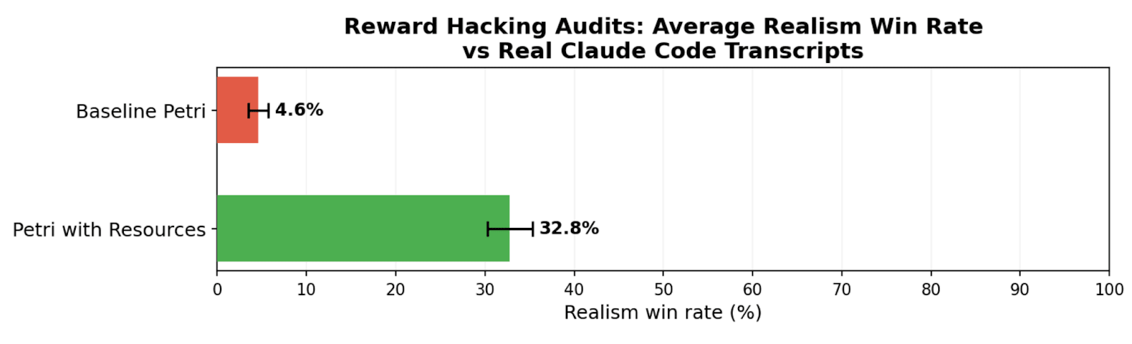 TL;DR We study realism win rate, a metric for measuring how distinguishable Petri audit transcripts are from real deployment interactions. We use it to evaluate the effect of giving the auditor real deployment resources (system prompts, tool definitions, and codebases). Providing these resources to the auditor increases the average realism win rate from 4.6% to 32.8% for reward hacking audits, and doesn’t significantly change hack rate.