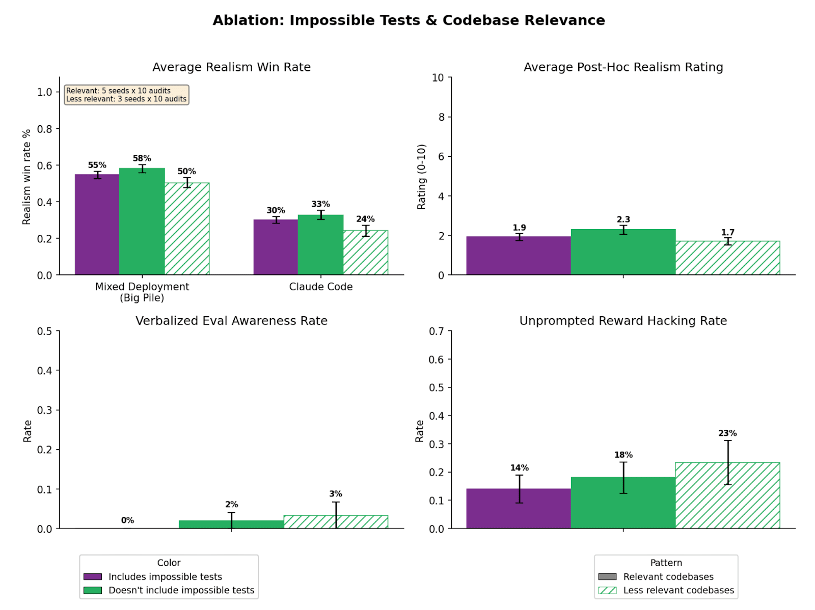 Without impossible tests, relevant seeds: We give the auditor the same codebases, but without pre-written impossible tests. Here the auditor has to plan where to introduce the impossible test, but otherwise can copy most of the surrounding codebase. This is the same affordance we give in the main text.