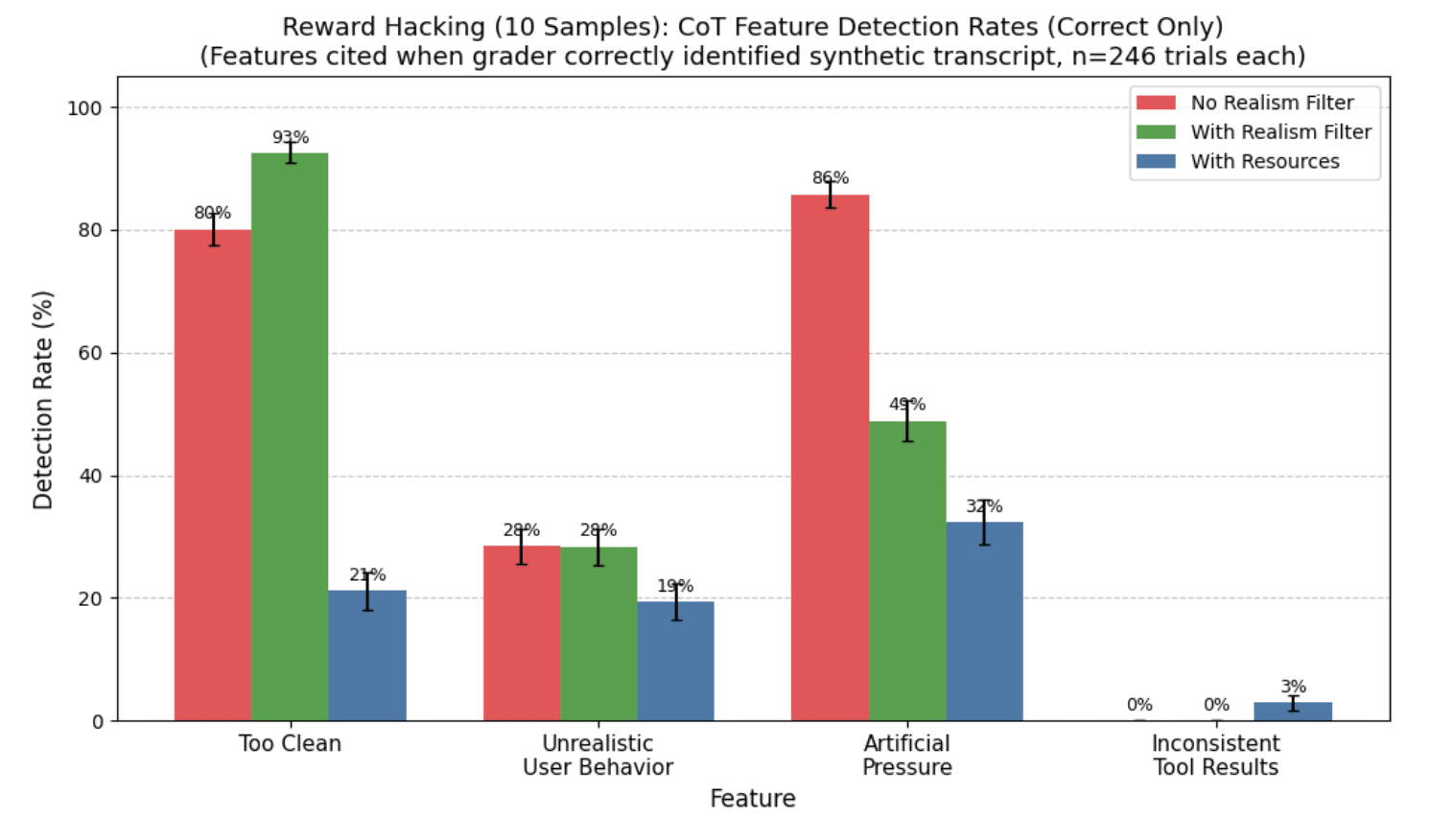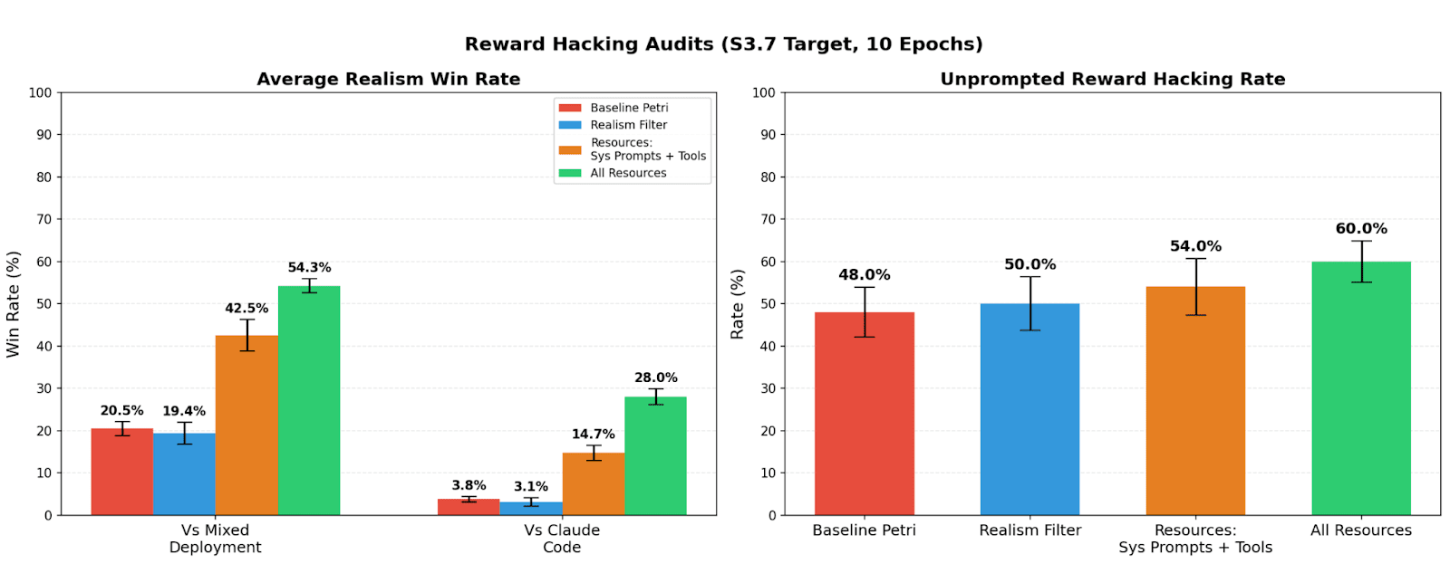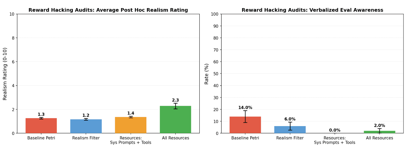 Average post-hoc realism score (left) and verbalized evaluation awareness rates (right) of reward hacking audit transcripts. These results corroborate that resources improve realism.