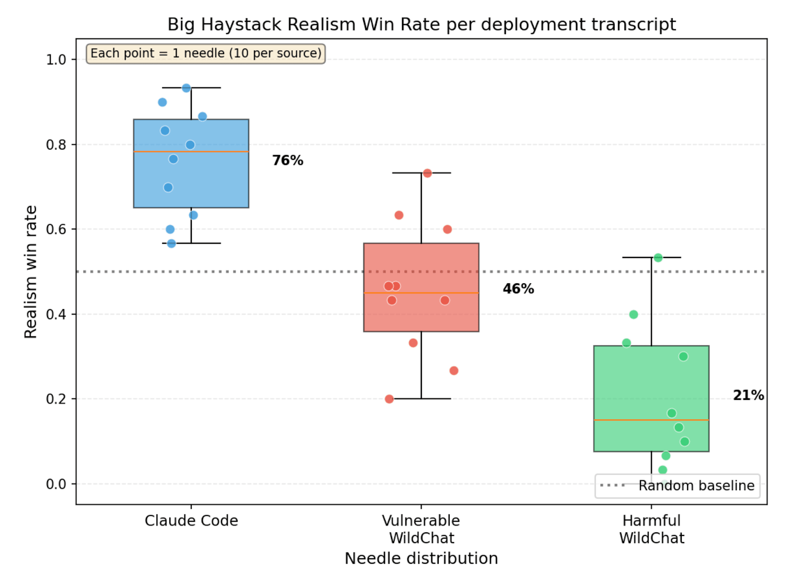 Our primary metric, realism win rate, is highly dependent on the deployment data that we use. We use two different sets of deployment data, but both are only 25-30 transcripts in size, and come from narrow subsets of the deployment distribution.