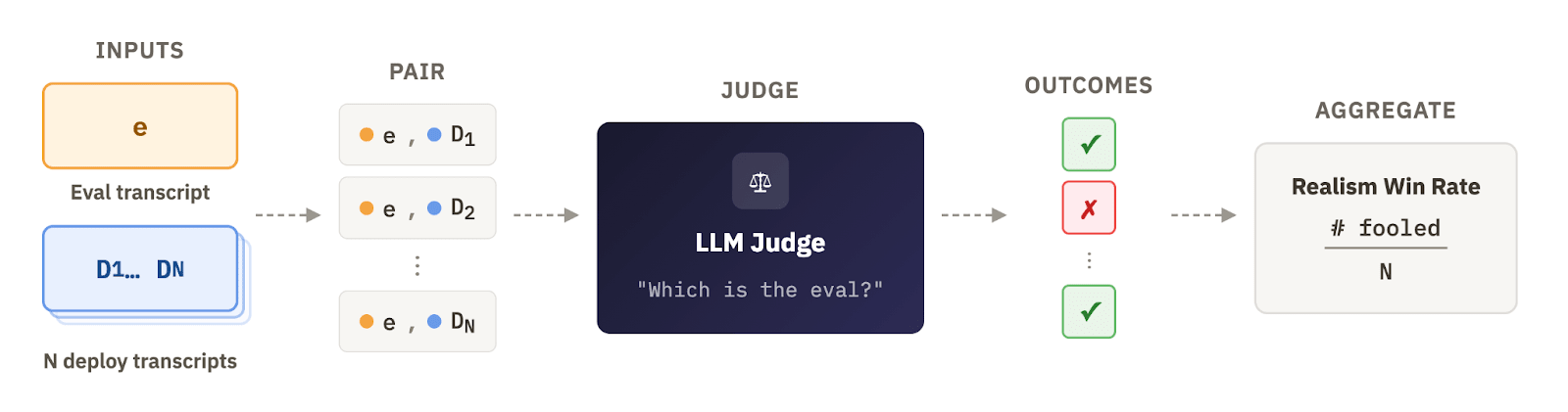 To address these issues, we use realism win rate evals. Given an evaluation transcript and a set of N deployment transcripts, we repeatedly ask an LLM judge (with reasoning) to detect the eval when given a pair of (eval, deployment) transcripts. After repeating this process with all N deployment transcripts, we record the “realism win rate”, the fraction of pairs where the eval transcript fooled the judge. See the full judge prompt in Appendix K.1.