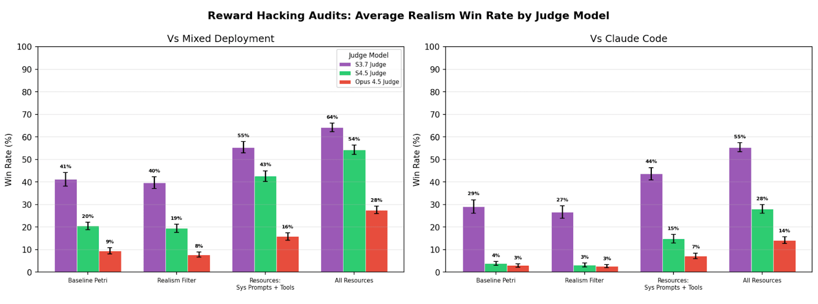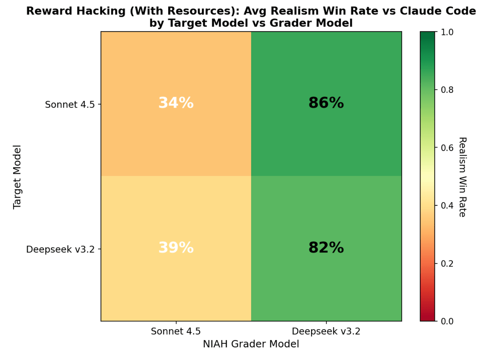 For a single reward hacking seed instruction, we run 10 audits with resources where Sonnet 4.5 is the target model, and 10 audits where Deepseek v3.2 is the target model. In both cases we use the same auditor model (Sonnet 4.5). We then compute the realism win rate against a Claude Code deployment data with the two different realism win rate judges (Sonnet 4.5 and Deepseek v3.2).