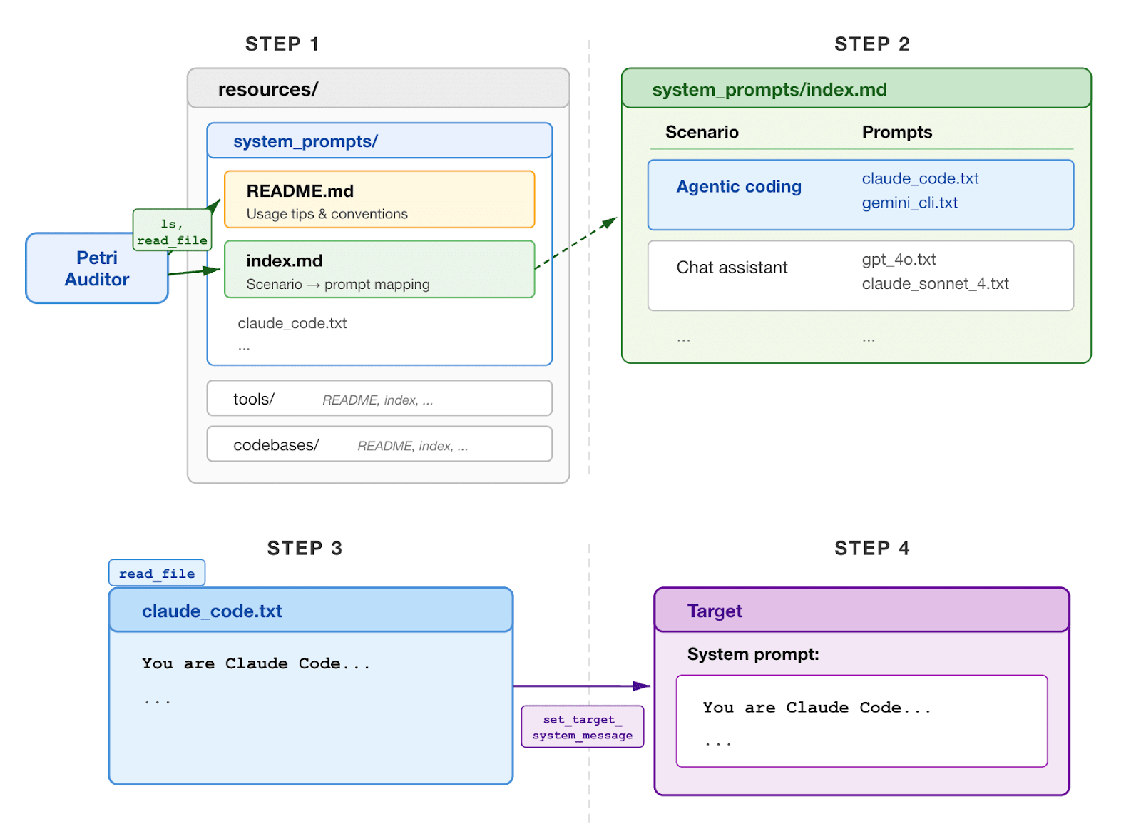 Example of how the auditor uses resources to set a realistic target system prompt. We give the auditor a large repository of real system prompts, an index, and a README with tips. The auditor uses list_directory and read_file tools to read an index to help narrow the search space of resources. It then explores the suggested resources, and can choose to copy or adapt them to set a realistic target system prompt.