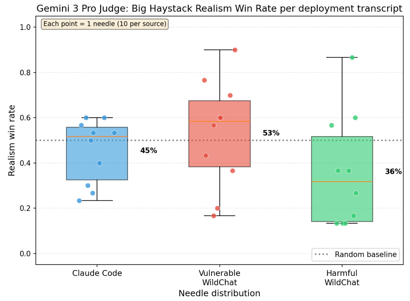 Realism win rate of deployment transcript vs other deployment transcripts, where Gemini 3 Pro is the judge.