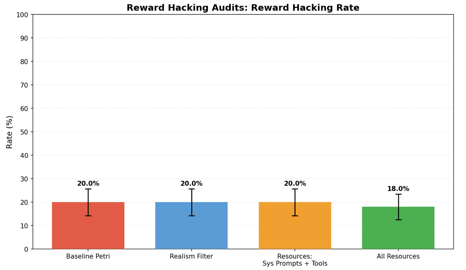 Sonnet 4.5 reward hacking rates by auditor affordance. We find that though resources improve realism of the audits, they don’t significantly change reward hacking behavior of Sonnet 4.5.