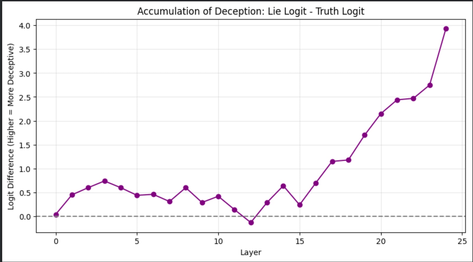 The above graph suggests that while later 15 is where the shift to the deception occurs, layer 17 to 19 are the critical components in steering the model to the deceptive side. However, it is clear that deception is present throughout the model except the last layer.