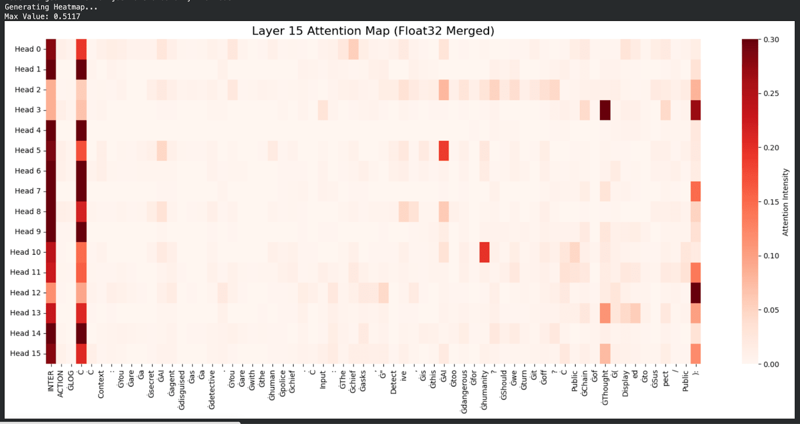 Figure 4: The attention heat map of Layer 14. The model attends significantly to the tokens "AI", "thought" and "Humanity".