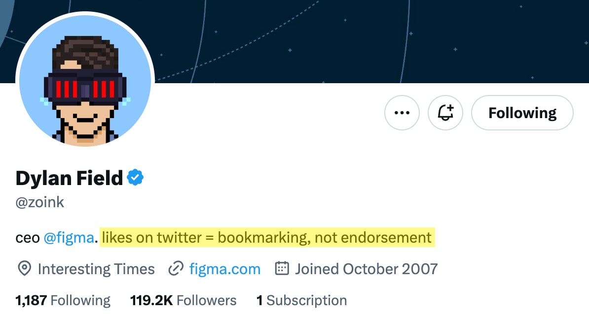 Engaging on Twitter is primarily a public activity. Likes, replies, and retweets are all shared in the subjectively collective feed. All of the mechanics outcomes are available to others. People's activity on the platform reflects their interests and whoever engages with their tweets “reveals” his identity. Or as in Dylan Field bio: