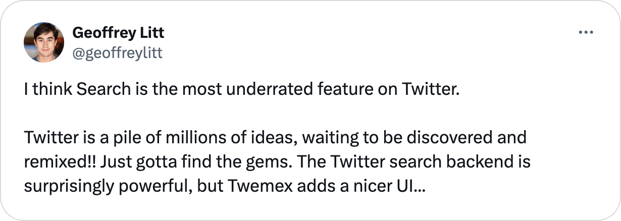 Tweemex. This is probably my favorite. Twitter has built an extremely useful product that has become an important information hub for many. However, searching on Twitter is cumbersome. Although having built an advanced search mode, with lots of operands, it isn’t widely known. This is where Twemex comes in. Over the years I discovered Twitter as a better search engine than Google in many ways. The authentic, unpromoted content created by real humans made me rely on Twitter often whenever I’m researching different topics. Twemex leverages the advanced search functionality while making it accessible. Serendipity occurs in random ways, but using Twemex increases such moments.