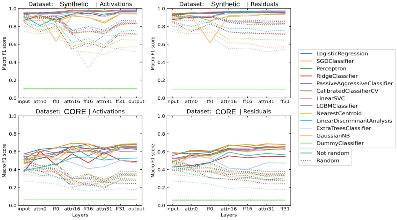 Probes using activations from the randomly initialized model performed much worse but were still above chance