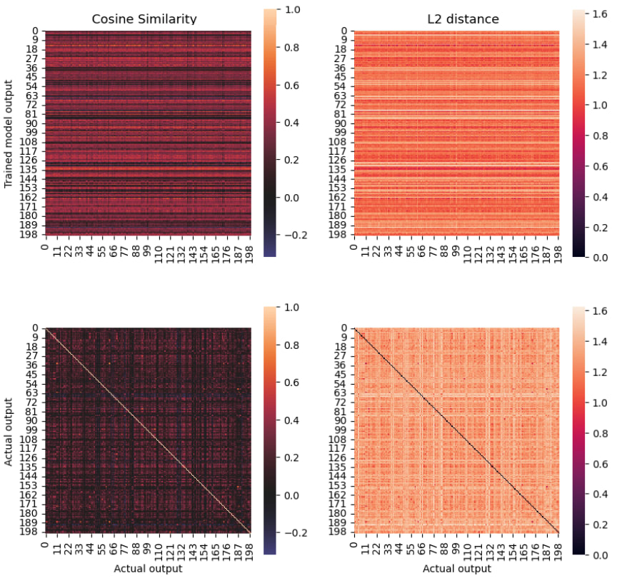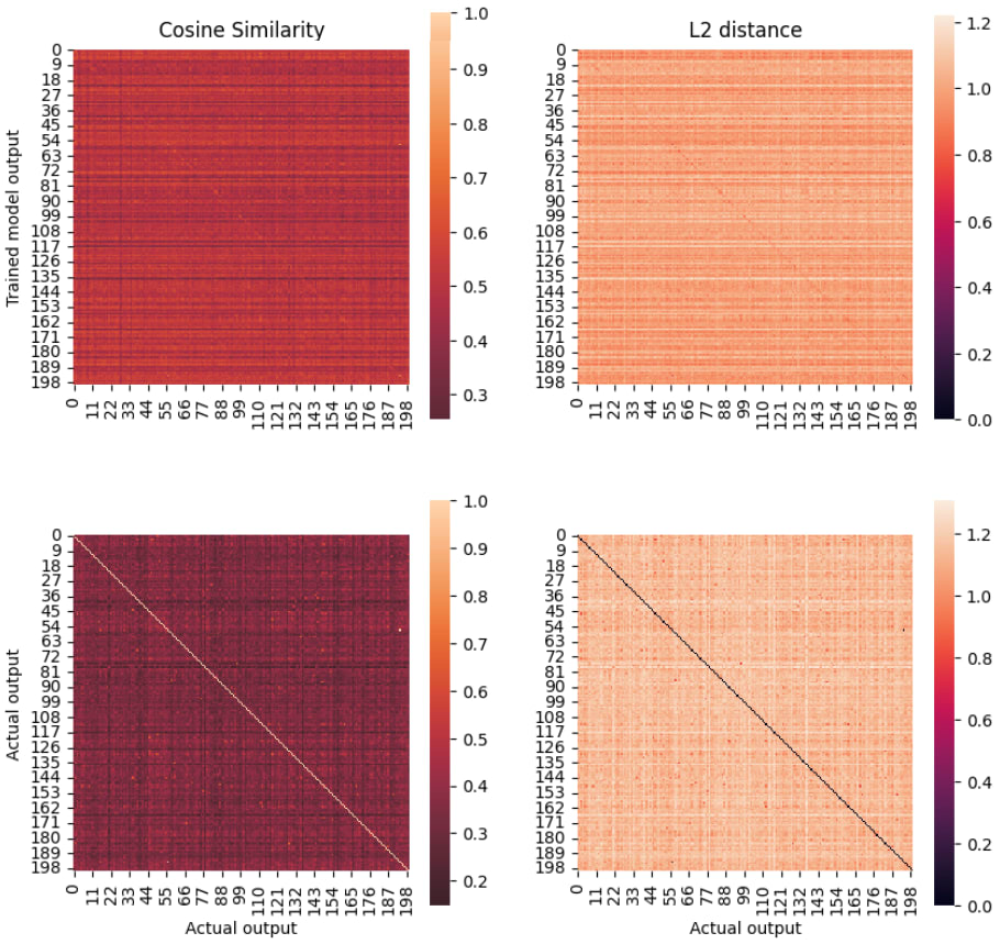 The top-row heatmaps compare model outputs against actual target outputs using cosine similarity and L2 distance; the bottom row compares actual target outputs with one another. The closer the top-row heatmaps are to the bottom-row heatmaps, the closer the model outputs are to the actual results.