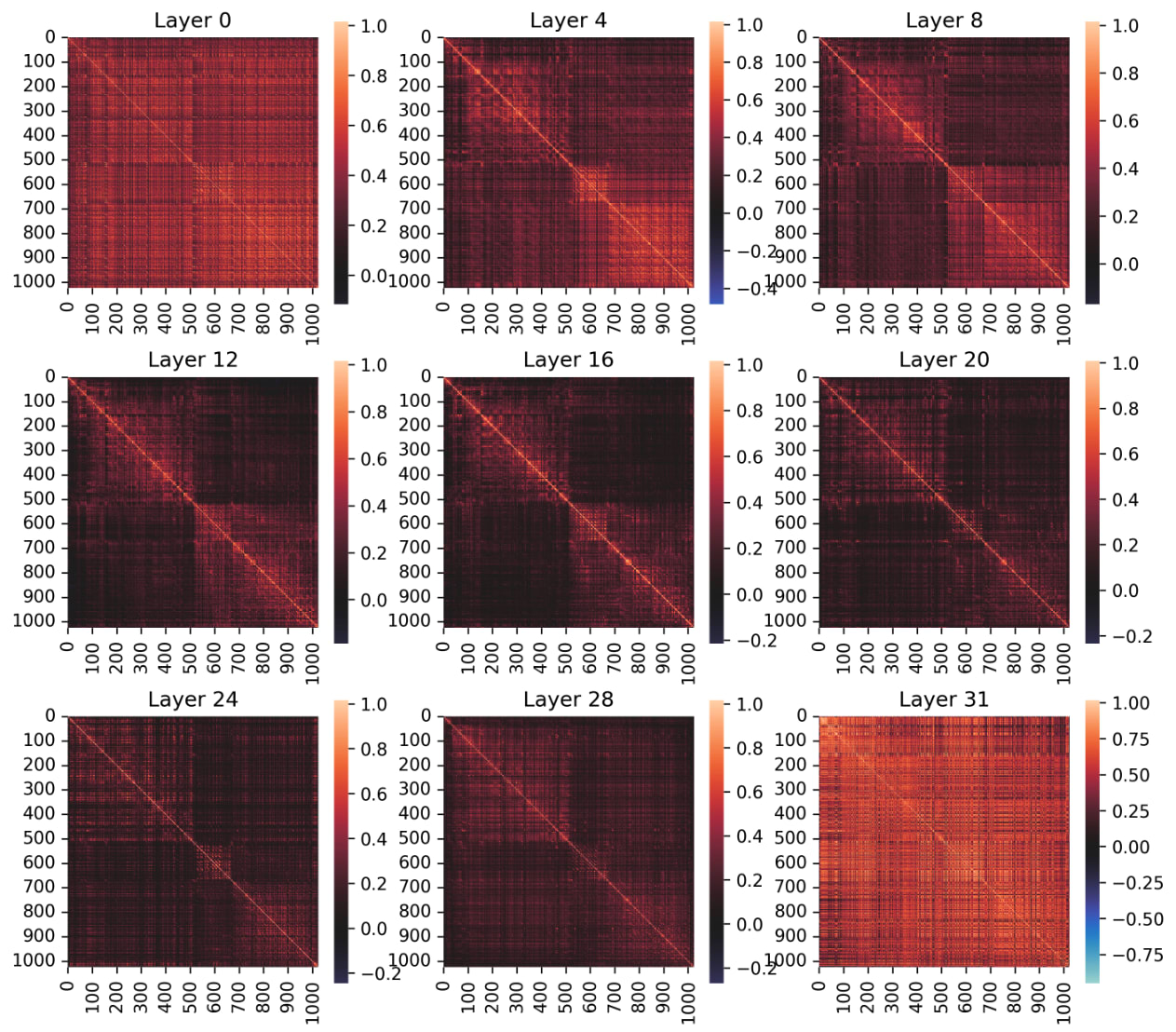 Each heatmap shows the similarity between pairs of token representations at a given level of the model. The coordinates correspond to tokens, and lighter areas indicate groups of tokens with greater similarity; these may correspond to coherent text segments or paragraphs.