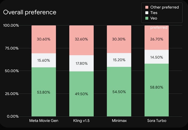 They claim people in a survey chose Veo 2 generations over Sora Turbo by a wide margin, note that the edges over the other options imply Sora was sub-par: