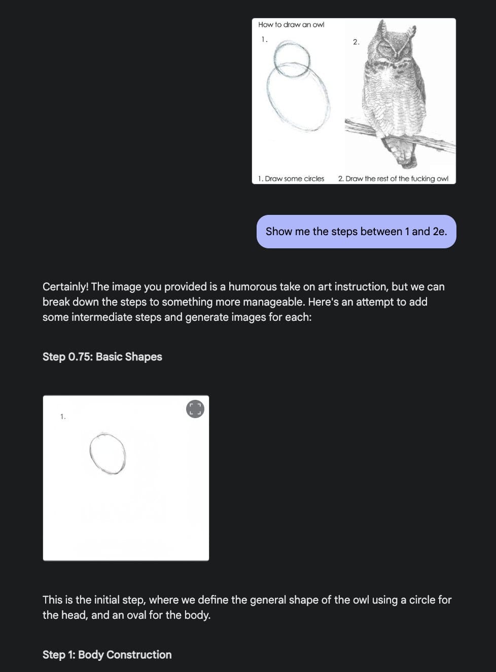 Mostafa Dehghani notices that Gemini 2.0 can break down steps in the ‘draw the rest of the owl’ task.