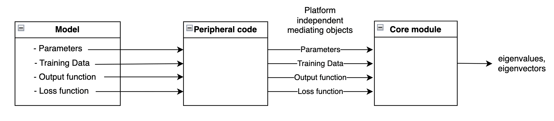 For each new model we want to analyze, we first generate the mediating objects and then pass them on to the (platform-agnostic) core module for eigenspectrum computation.