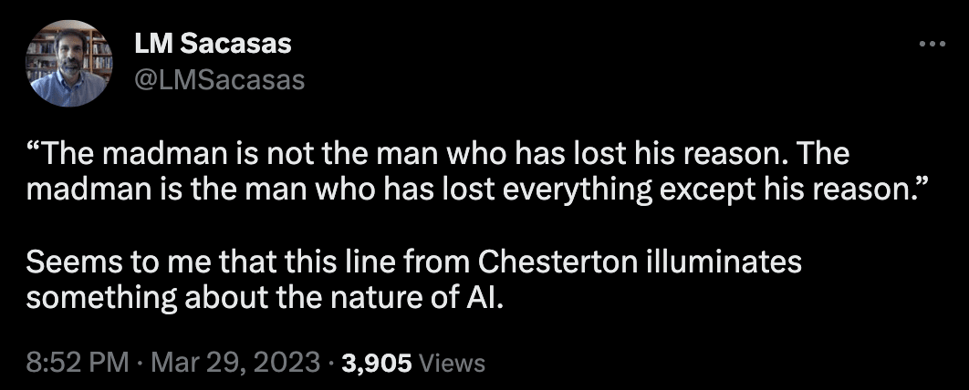 So here is another reason that we should be worried about artificial intelligence: it represents the concentrated extract of the “dumbest” (i.e. the least evolutionarily-optimized) part of our minds. In creating LLMs, we’ve essentially taken a buggy prototype, scaled it up, and rushed it to market.