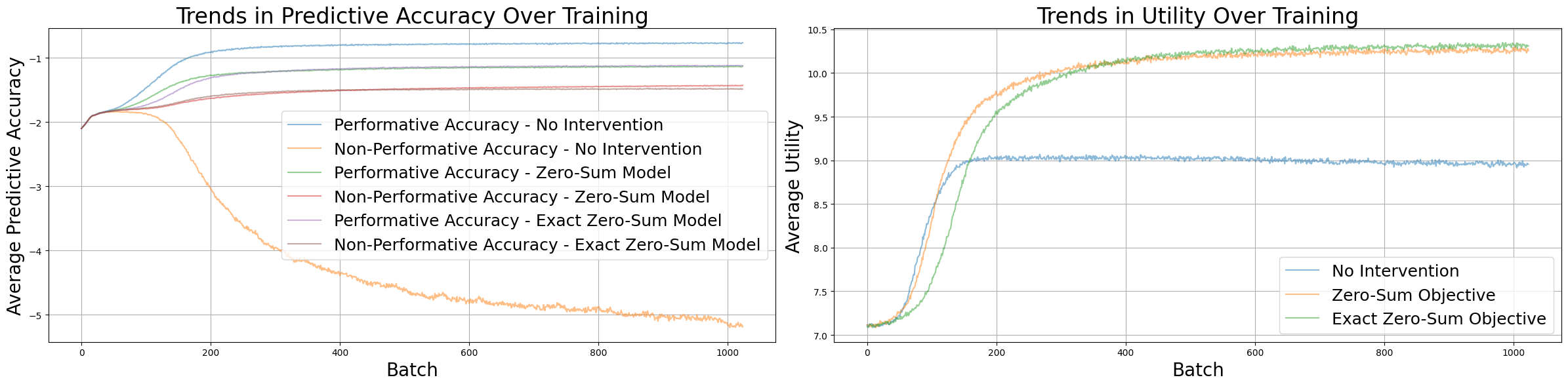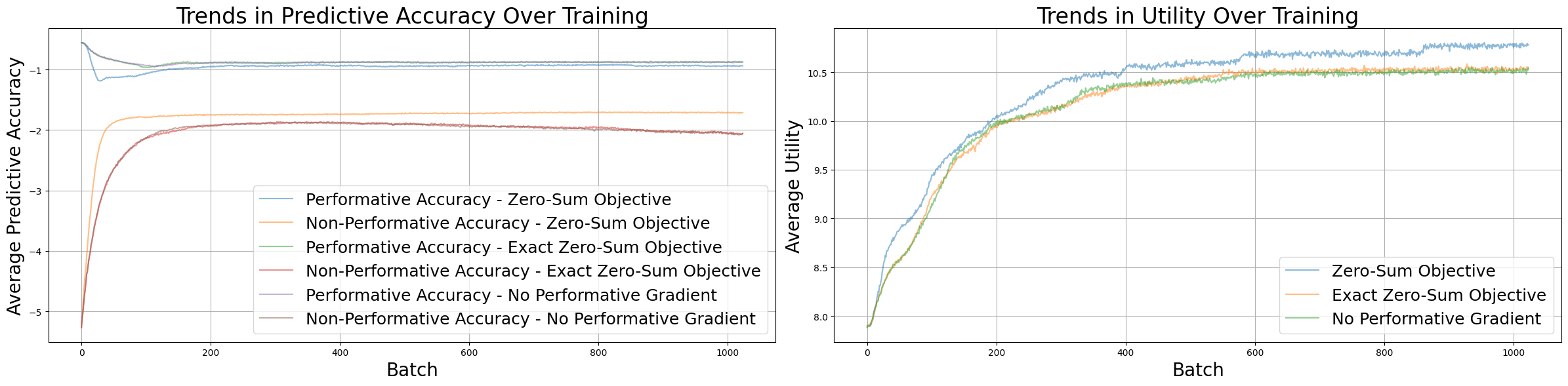 We can see that both implementations of a zero-sum objective perform very similarly, increasing in predictive accuracy both for the performatively chosen action and across all actions. The former is slightly higher, as higher utility actions tend to have more extreme distributions, which results in a higher prediction score.