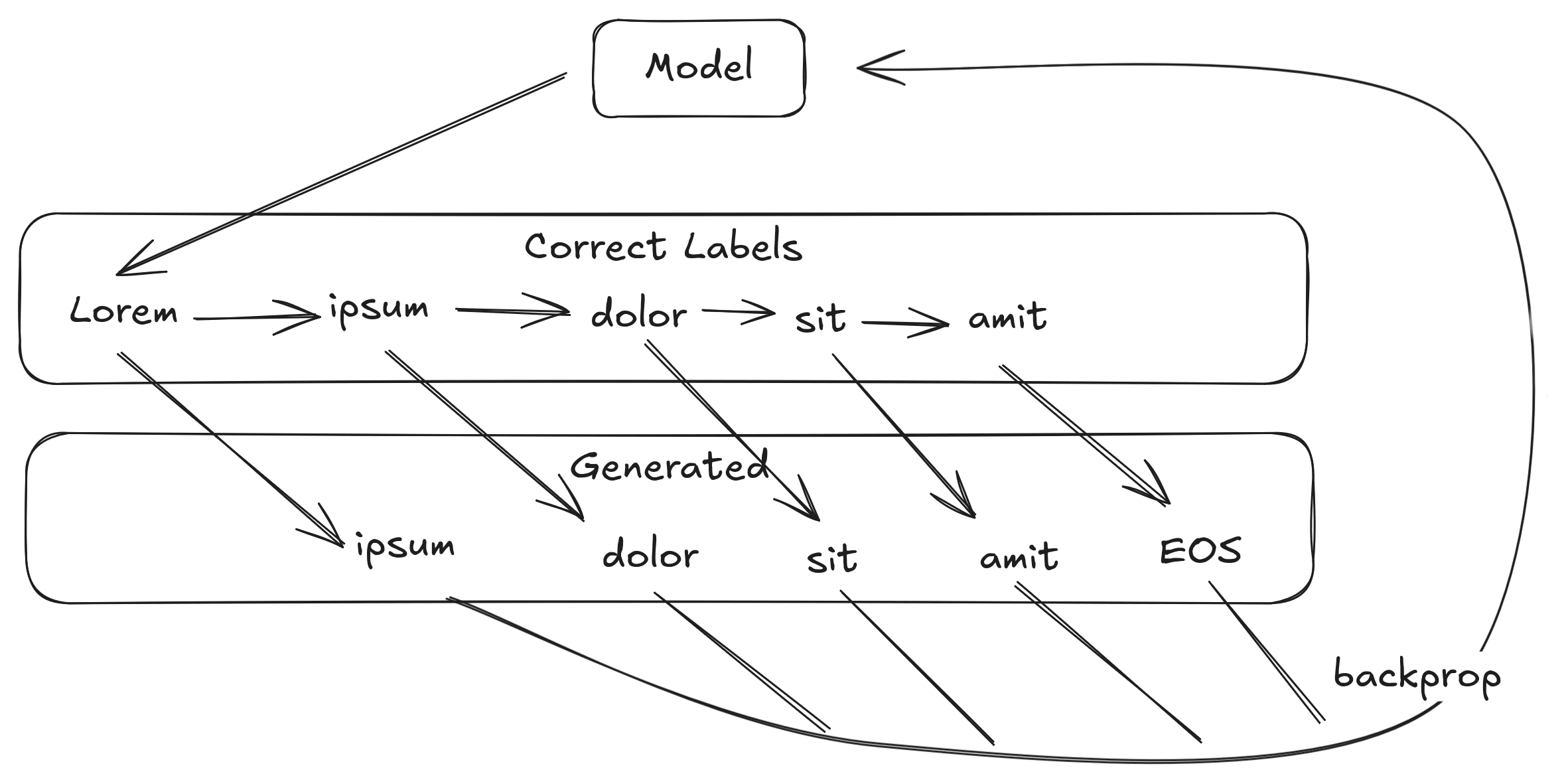 The optimization—called teacher forcing—is that LLMs only see correct outputs during training.