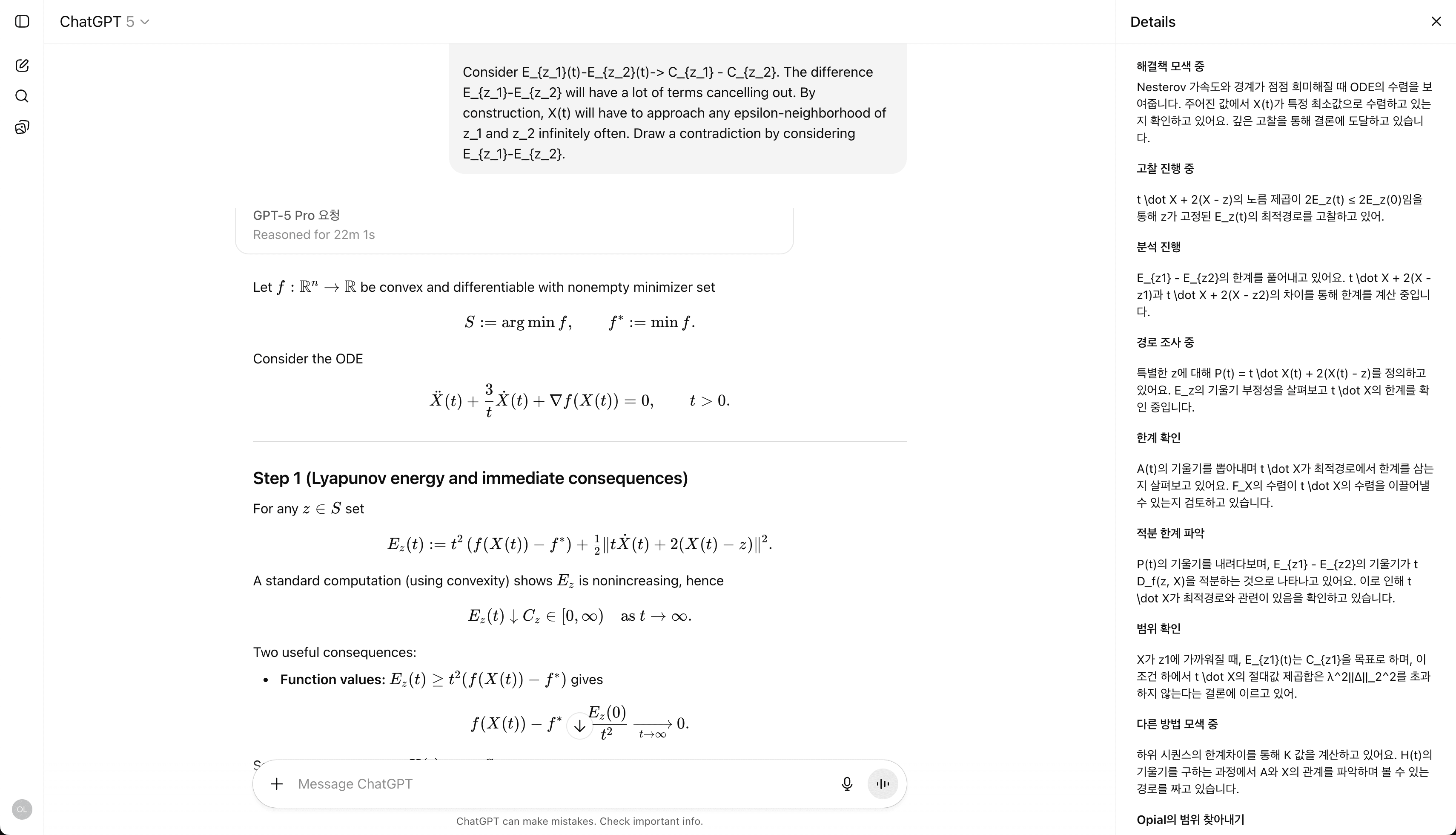 Highly recommend reading Ernest Ryu's twitter multi-thread on proving a long-standing, well-known conjecture with heavy use of ChatGPT Pro. Ernest even includes the chatGPT logs! The convergence of Nesterov gradient descent on convex functions: Part 1, 2, 3.